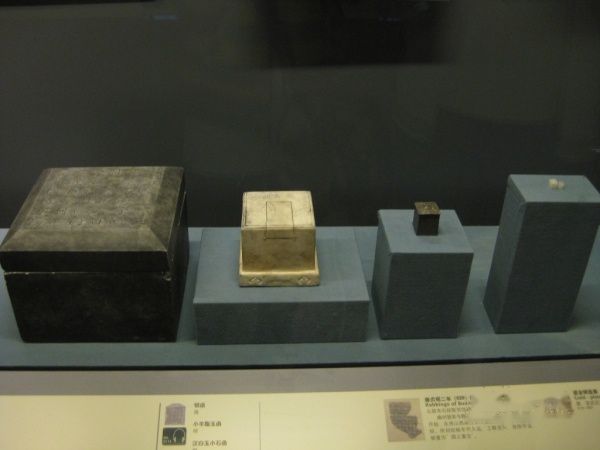 舍利函,盛装佛主舍利的。隋代银函和青玉石函,另外两个是明代的小羊脂玉函和汉白玉小石函。