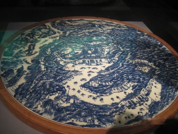 这个是青花御窑厂图瓷板。上面是景德镇官窑、民窑烧磁的画面,牌坊、窑上的青烟,还有取土的山,不尽其详。