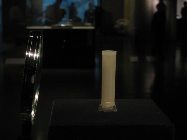 这个,更神奇,羊脂玉“般若波罗密多心经”勒子。高5.8cm,直径1.4cm,玉身上刻着292个双钩阴文楷书体,就像讲解员说的,那时还没有放大镜、显微镜之类的,工匠只能盲刻。馆里放置的放大镜倍数不够,看不清楚。展室里有一个电子讲解,其中有一幅上面楷书的照片,有了放大设备,刻出来的也不过如此而已。