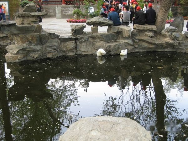 在等导游,这时是3点左右,园子里的人还是很多。右面那张是出园是的PP,前后相差两个小时,却安静许多。