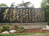 大明湖一进门处,毛主席的狂草诗篇影壁。采桑子《重阳》人生易老天难老,岁岁重阳,今又重阳,战地黄花分外香。一年一度秋风劲,不似春光,胜似春光,寥廓江天万里霜! 1929年农历九月初九重阳节. 园林设计有问题:应地上种满黄色花,来烘托毛主席那充满豪气的诗句---战地黄花分外香!.