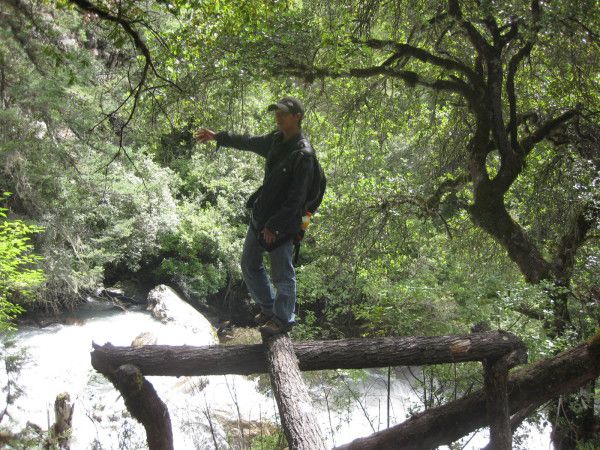 在这内转线上拍照一定要留个心眼,特别是岩石边上,因为一不留神可能你真的就永远留在这了。看到树上还张贴着早已褪色的寻人启事,顿时心生警惕。有时看到前面有状况,‘天咏’蹦蹦跳跳的就过去了,看得我心惊胆战的。应大姐一路是狂飙在前啊,不明白她今儿个咋走的这么带劲,一会人影就不在我们的视线之内了。半路上还遇到当地转山的一家子,他们正砸着那核桃呢,我们就也分享一些了。新鲜的核桃就是不一样,特嫩的说。顺便打听他们见着大姐没?还好在没多远,这下就安心了。发现自带的水都喝完了,于是问‘天咏’这雨崩河的水能喝吗?天咏说不是都能喝的,于是他给我们找了处干净的水。有点农夫山泉的味道,带点甜的,O(∩_∩)O哈哈~。