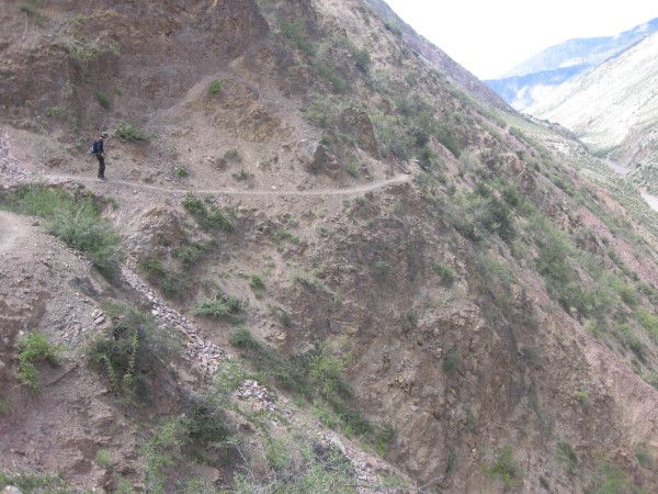 中午时分,到达了尼龙村。休息用餐,期间突然发现手背被晒伤了。长袖就遮到手腕处,这一点没遮下就成这样了,回来后就脱皮了,见识到了高原的紫外线喽。出了尼龙村就一直沿着澜沧江走了,这路一下更窄了,而且碎石多,容易滑脚。有恐高的人尽量别看下面。有些地方,我根本不知道该怎么下脚过去,‘天咏’就在旁协助我们一个个。期间,蒋同学脚底打滑了,‘天咏’去拉他,两人沿着那崖边滑了一小段,这个场面把后面人吓的直尖叫(事后小颖说的,我走在前没在意)。一个个立马集中注意力,下脚稳点。这一路上阿若一直缠着小颖教他广东话(她在广东读书),但是呢,他那学的水平真的令人捧腹大笑,一个“小妹”的广东话他学了不下几十遍,还在纠正。他和小李双剑合璧,两活宝啊。再翻过一个村,就进入西当范围了,天咏说看到公路就到了。后来走着走着才发现,什么公路啊,就是好点的土路呗,泥都没豁上呢。哈哈,爬了梯,穿过玉米田,没多久,突然抬头看到松吉喽。天哪,那下我有点幻觉了。这尼龙线转完了?我们解放了?(^o^)/~。我笑说:松吉啊,这3天是不是可想我们了,我们可是一路念着你啊。松吉笑笑:还好你们一个个都没灰头灰脸的出来,没黑哈。