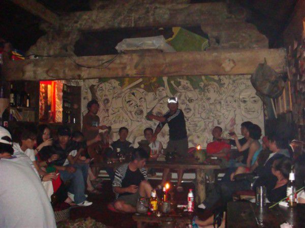 正当我们没头绪的乱晃时,小杭电话来了,说带我们去一好地方,于是我们在大石桥上等。见过小杭的照片但遇见真人还是被她独有的气质感染,清爽是她给我的第一感觉。“纳兰”二字源于她最爱的纳兰容若即纳兰性德,一个词人,当然它的意思远不及此,大家可搜索这个客栈便可深度了解她。我们随小杭走到五一街的尽头,拐个弯看到了38号的字样,一进门墙上的一幅蜡画吸引我们所有的目光,思索着该是怎样的人画出如此的画?顺着楼梯上去,一个强烈的磁场就把我震住了,房间里大家围着几个吉他手在歌唱,大部分是长期流浪在丽江的人。房间外一小拨人围着火堆在私语。壁上的人物画彻底征服我了。38号是我始料未及的美。堂主“蛛蛛”亲自调制的“黯然销魂”酒,略带浓郁的香,混着冰块的凉爽,在唇齿间游走,顺入吼道是沁人的爽口。不禁让人想多饮。但毕竟酒力有限。这样的夜很是不舍离去。但我知道,我终究只会成为她的过客,她的摸样却从此刻在了某个柔软的地方。