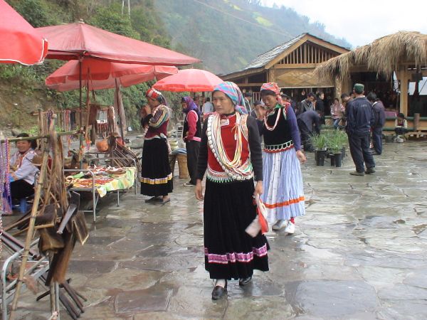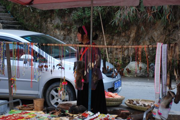 观景台为一个修建在公路边的石砌平台,以圆木为护栏,并立有一个写着“石月亮”的巨石。这里有许多傈僳族、怒族妇女,身者鲜艳的民族服装,售卖旅游工艺品。