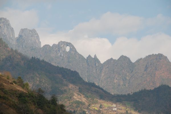 转过利沙底乡热闹的集市,就远远的看见高黎贡山顶上那个圆形的,透着蓝天白云的巨大山洞,石月亮。随着车子在公路上行驶,她离我越来越近,有一阵和碧蓝的怒江一起,似乎就在我们眼前。但转过一个山弯,我们又开始渐渐的远离她。正准备遗憾之时,车子来到左洛底村,在石月亮观景台停了下来。