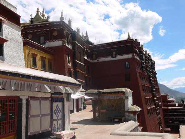 **红宫旁喇嘛的住处** 现存的布达拉宫实际上是由五世达赖政教合一时下令重建的,距今一千多年前松赞干布所建的布达拉早已在一次雷击中被烧毁。虽说是重建的,其辉煌程度毫不逊色,特别是其中供奉的五世达赖和十三世达赖的灵堂,两者加起来所用的黄金数量有近四吨之多,加上外表镶嵌的各种宝石、珍珠、玛瑙等珍品,可谓是无价之宝,里面供奉的大小佛像更是不计其数。顺便说一句,布达拉宫是全国唯一一座常驻武警部队的寺庙宫殿。