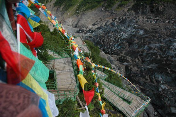 ◆明永冰川:是卡瓦格博峰下最有名的的一条冰川。这是一条低纬度热带季风海洋性现代冰川,山顶冰雪终年不化。由于明永冰川所处的雪线低,气温高,消融快,靠降水而生存,因而它的运动速度也快。到冬天,明永冰川的冰舌可以从海拔5500米往下延伸到海拔2800米处,如一条银鳞玉甲的游龙,从高高的雪峰一直延伸到山下,直扑澜沧江边,离澜沧江面仅800多米。