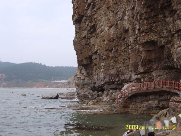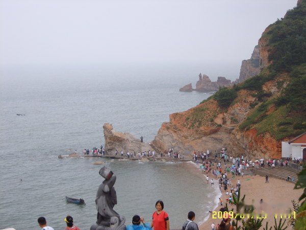 大概20分钟后, 来到长岛 下船就有一位白发大娘一路跟随 说是包车60元 我有意前往 同伴却说码头里打车会挨宰 于是在大娘喋喋不休的声音中 来到街上 看到一个中年人开车 张嘴120 晕!几经讨价还价,最后还是60成交,三个景点望夫崖--九丈崖--月牙湾(通票100元)