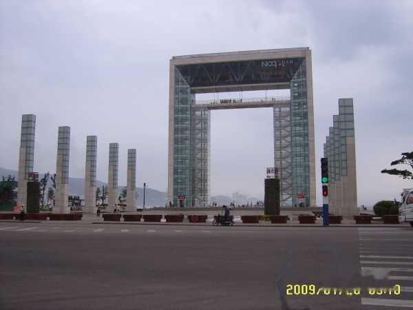 一个半小时后,来到威海,问了司机,去码头怎么走,他直接在老汽车站把我们放下了。下车便看到宏伟的“威海之门”--幸福门。