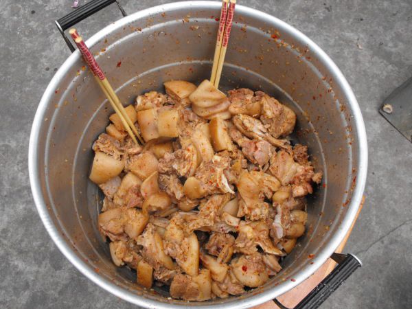 尽管很大个但是肉质却是鲜嫩,朋友的父亲在我们去之前早早的将乳猪肉准备好,貌似是煮熟然后凉拌的。味道真的很好,我不能明白怎样可以让那么大块的肉做的那么美味。在去凉山之前就听说过凉山彝族款待贵宾就是用咜咜肉,必须是小乳猪,因为在彝族人眼中小乳猪是很干净圣洁的。在彝族有大口吃肉,大口喝酒的习俗,这些都可以看彝族是豪放的,对朋友是友好的、好客的。