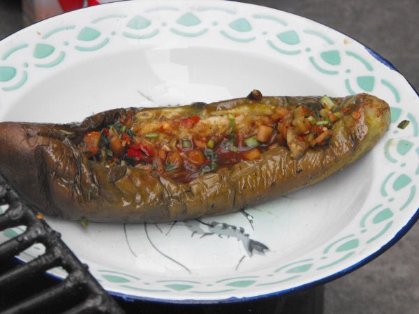 中午很犯罪的吃了很多肉,晚上本来打算补救一下。但是他们不给我这个机会,晚上是吃烧烤,以烤肉为主。烧烤架是简单的火盆上架上一个方形的架子,在大凉山是家家户户都有的,不需要特意准备。烧烤就不多说了,但是一定要介绍一下烤的这个茄子。把一整块茄子放在火架上烤,烤到茄子软掉后,用筷子把茄子“剖腹”,放进当地特色的酸菜,就成了色香味俱全的烧烤茄子。实话,小女子是第一次吃到这种烧烤茄子。