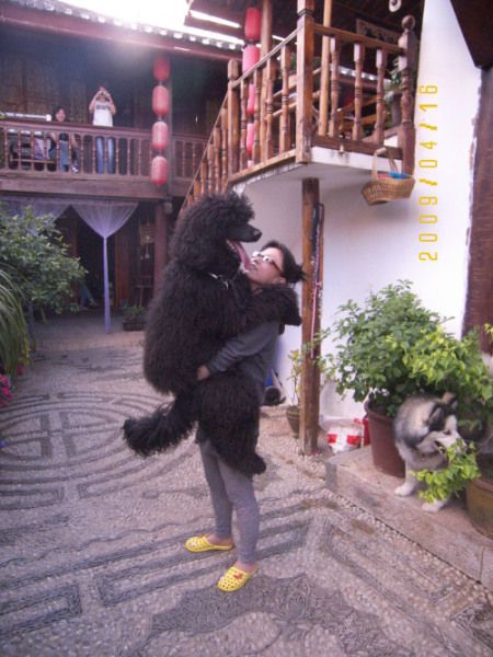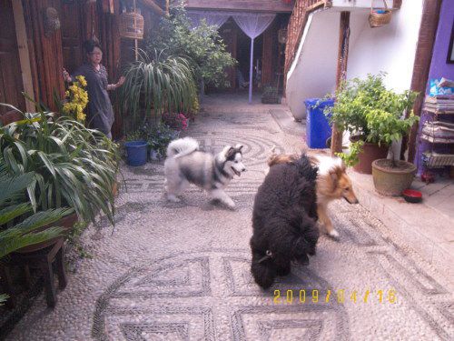 丽江住在了桑大娘介绍的梅府大院,老板两口人很好,很热情,还是东北加河南老乡,难得。最喜欢他们家中养了三只大狗狗,一只巨贵,一只牧羊犬,还有一只阿拉斯加,那只叫王子的黑色巨贵和人特亲,一直往我身上扑着玩,很是可爱。