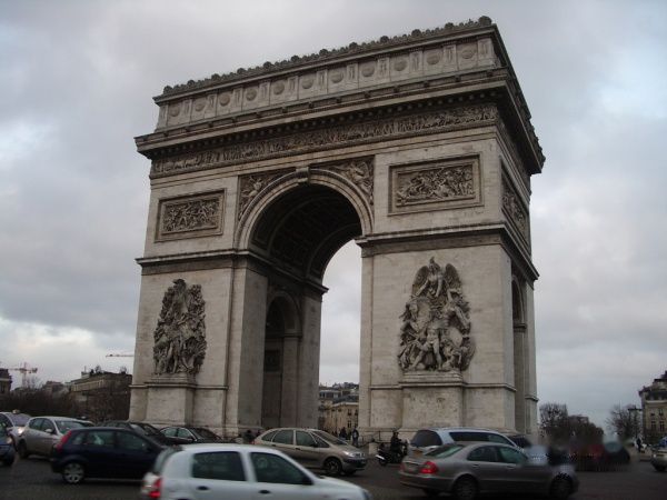 凯旋门位于巴黎戴高乐星形广场的中央,面对香榭丽舍大街,是拿破仑为纪念奥斯特利茨战争的胜利而建立,1806年8月15日奠基,1836年7月29日落成。它是欧洲100多座凯旋门中最大的一座。设计师是沙勒格兰CHALGRIN。星形广场凯旋门全部由石材建成,高48.8米,宽44.5米,厚22米,中心拱门宽14.6米。四面各有一门,门上有许多精美的雕像,门内刻有跟随拿破仑·波拿巴远征的286名将军的名字,门上刻有1792年至1815年间的法国战事史。