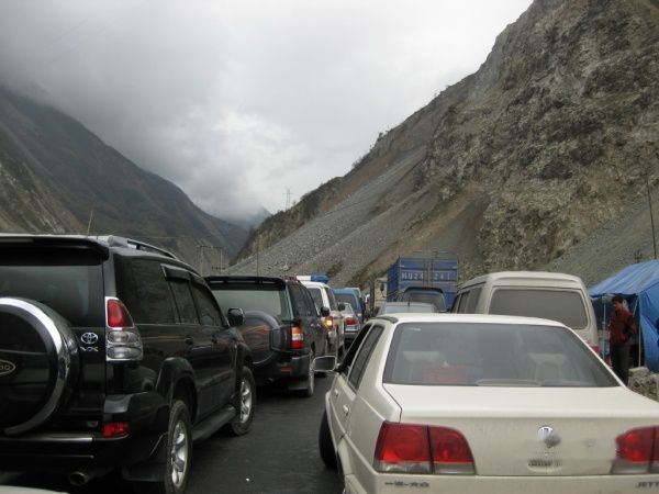 车子停了下来,估计路况不好,还在做一些处理琐事,我在前方我还真是看到不停有小石头滑落,石头滑落的时候带着烟。。。。。。等车子再通行之时,司机紧紧尾随一辆警车之后,司机希望警车能帮着我们开道让我们多避开几次塞车。