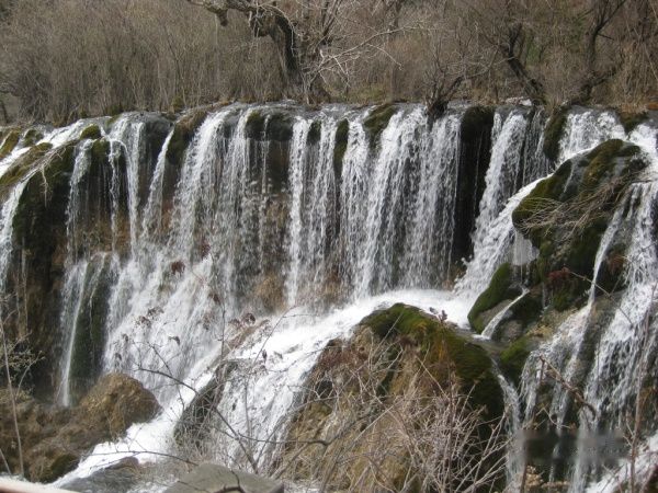 从成都到九寨有两条公路可以走,一条是成都经都江堰 茂县 松潘川主寺到九寨沟,另一条经绵阳 江油 平武到九寨沟。由于5.12地震的原因,原来通往九寨的常规陆路线路关闭,我们乘大巴过去就走了后一条线路. 一路路过了李白的故乡,大禹治水的地方,看了黄灿灿的油菜花,车从高速路下来就走了国道,路况开始不好,因为沿途也是受到地震影响的房屋,所以很多地方的居民都在重建房屋,很多砖块都沿路堆放,影响了车辆的行驶.所以警察会出来进行疏导交通,先放一边的车辆通行,然后再放另一边的.我跟丁姐一开始都谈论着地震,后来都自觉的不说了,因为谈这个沉重的话题太让我们难过了.车子越开路就越难走,气温也开始变低,我是边坐车边吃东西补充能量.然后就感觉车坐得太长时间屁股疼,我就挪过来挪过去的坐,还是不能缓解,我又把衣服垫在底下想舒服点,可是还是不行!我就坐也不是立也不是的样子,很痛苦的等待着车子快到目的地. 车子开始盘山,路变的崎岖不平,山体上还有积雪,我恍惚中有似曾相识的感觉,这一带的景色跟我小时候的居住地------老矿山好象呀! 我记得就是这样的山路,绕过这些山就是一条清澈见底的小河,然后小河边是一片草地,我还记得草地上有一棵很老的槐树.我在那棵树下跳舞,野餐和小朋友们一起嬉戏.嘿嘿,绕过了那山我还真是见到有条河,跟我小时候那条一样大,水流一样清澈.