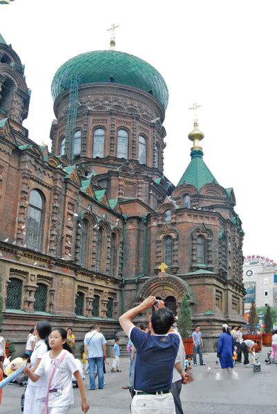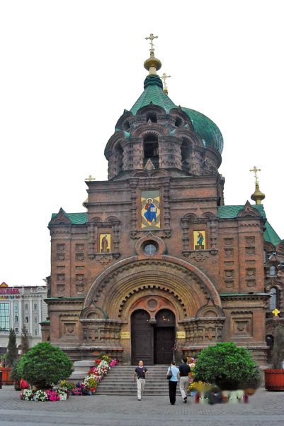 圣·索菲亚教堂气势恢弘, 精美绝伦。教堂的墙体全部采用清水红砖,上冠巨大饱满的洋葱头穹顶,统率着四翼大小不同的帐蓬顶,形成主从式的布局,四个楼层之间有楼梯相连,前后左右有四个门出入。正门顶部为钟楼,7座铜铸制的乐钟恰好是7个音符,由训练有素的敲钟人手脚并用,敲打出抑扬顿挫的钟声。