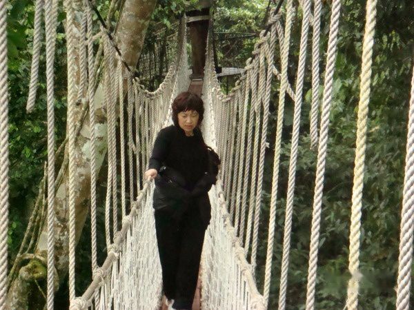 虽然心疼,不过好在下车后到公园入口的一段路上,我们马上就被沿途茂密的热带植被所震撼而忘记了刚才的不快!我们加快步伐赶到真正的景区,买了门票(35元钱/人),来不及存放手中的东西就冲进去了。山路小道,茂密的原始森林遮住了外面充足的阳光,显得格外幽静。已熟悉的热带植被让我们放慢了脚步尽情的欣赏。到了林间深处,再登上一罗旋塔,就来到了著名的“空中走廊”。这走廊,是用粗大的铁索在高大的望天树之间连接而成,用钢绳悬吊,铝合金梯子作踏板,还有尼龙绳、网作护栏,看起来还满结实的。走上去摇摇晃晃,加之有36米高,不觉恐惧袭上心头。我颤颤悠悠走了一段,哪敢往四周看,到了与走廊连接修在树干上的木质平台,这才稍微松了口气。