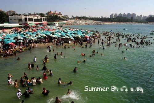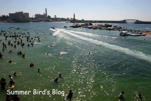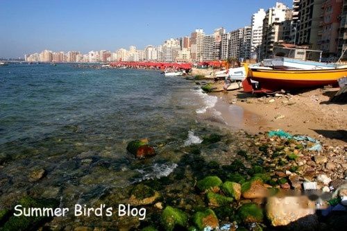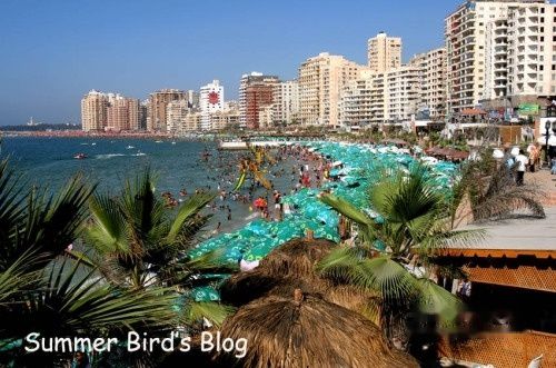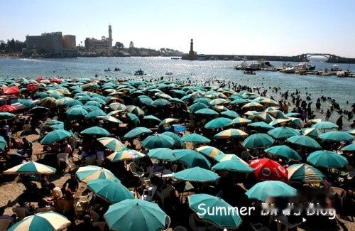 亚历山大城的度假天堂,海滩边遍布密密麻麻的遮阳伞,伞下挤满了人,他们或躺在折叠椅上闭目养神,或安静阅读,或聊天自娱。这边是全家老小其乐融融,那边是朋友、恋人追逐、打闹,而海湾里还不时传来那些游泳、戏水的年轻人兴奋的喊叫声。