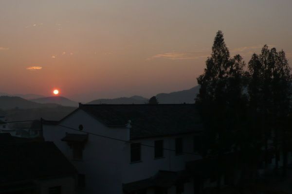 我和夫人于2008.10.20下午离开大慈岩悬空寺,在公路边等了一辆去新叶的中巴(去新叶的车很多),约半小时在近黄昏时到达新叶。在村口小卖店我们安顿住下后就进了村。进村后见路边有个小饭店,就进去,想着先吃点饭顺便向店老板打听一下村里的情况。老板见我们是外地游客很热情,没等我们问就向我们介绍起新叶村,还趁备饭时间请老板娘领我们在村里转转。老板娘人也很好,领我们看了村里的主要景点,并告诉行走路线。由于天色已晚,几乎所去景点都已关门,虽然景点内未看成,但外貌也看了大概。新叶村的黄昏其景色也是很美的,感觉即古老又安静。在夜幕将降之时我抢拍了几张照片,也算同享落日时的新叶。