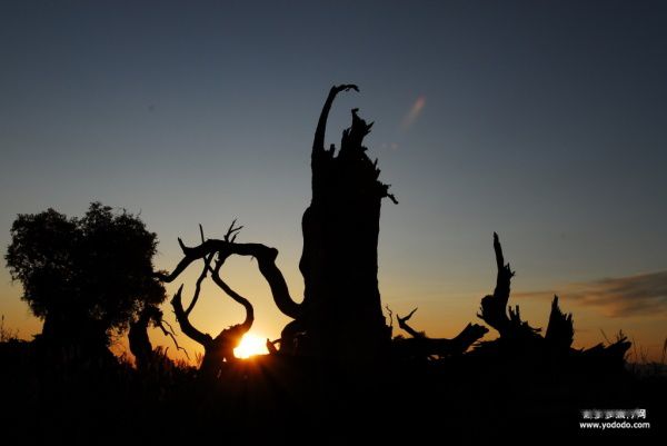 10月5日 九点半,离开沙漠孤城前往木垒哈萨克自治县。该县位于天山北麓东段,准噶尔盆地东南缘。按照计划,在木垒主要是拍原始胡杨林。想起那活而千年不死,死而千年不倒,倒而千年不朽的精灵,有一种冲动从心头泛起。。。在奇台县吃了一餐经济而丰盛的中餐,下午基本上是行驶在茫茫戈壁沙漠。一条简易的沙石路总也望不到尽头。路比较颠簸,灰也重,有时前轮扬起的灰尘把后面的车窗都蔽得不见天日。路上,一台越野车爆胎侧翻,另一台车拐弯时估计车速过快也是侧翻,好在人都伤得不重。经打听,得知都是搞摄影的,分别来自北京的湖南,都是冲着原始胡杨林来的。走到离胡杨林只有三十多公里时,已经没有固定的路了,看那架式,有点象巴黎至达喀尔汽车拉力赛。不过,隔那么远就插面红旗树个路牌,地面平坦,还好识别。夕阳下远处几个小白点闪着诱人的光,那就是我们的目的地的蒙古包。我不由地感叹道:胡杨林啊胡杨林,这么多人不远千里历尽艰辛,流血流汗,就为了一睹你的伟岸身躯,解读你的不朽精神。七点,二百四十公里路程,历时五个多小时,我们终于到达。顾不上车途劳累,趁着夕阳美丽光芒,我们立即投入拍摄。。。