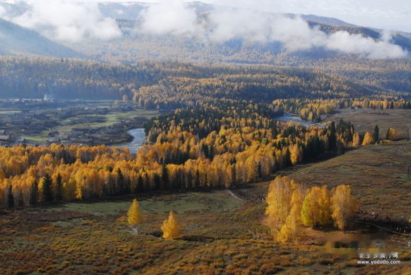 9月30日 太阳蒙在乌云里,禾木蒙在白雾里,我还蒙在被子里。这就是我禾木的第一个早晨。禾木全称叫做禾木喀纳斯蒙古族乡,蒙古族图瓦人,哈萨克族人居住在这里。禾木号称神的自留地,后花园,也是摄影爱好者的天堂。在禾木河谷,成片的白桦林遍布山野,白色挺拔的树干,金黄色的树叶,美不胜收。上午,太阳又给了两个小时的面子,几天都这样了。抓紧时间拍片吧。吃完中饭又开始下起雨来,看样子这雨一时半晌也不会停。片是拍不成,几个人就猫在屋里,利用这难得的空闲观片,谈片,自由、轻松地交流。旅程刚好进行了一半,也算是个小结吧。又洗了个热水澡,简直比吃一顿猪肉还爽。为什么这么说,因为这地方大多信奉伊斯兰教,加上开车的小伙是回族,他找的饭馆都是清真。七天了,在我们强烈要求下,才在布尔津县城吃过一顿猪肉。驾驶员就只好一个人去吃羊肉拌面了。