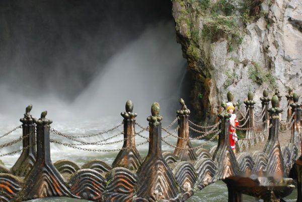 一进龙宫与天池相连,天池幽碧,围绕着古木参天,绿树青草。我们顺着一个小山坡上去,大约走了一二十分钟后到达了龙门飞瀑下游的石桥上。这座桥犹如闸口,桥前面一水平静,桥后面万水流奔腾。沿着水岸往上走,才到达真正的龙门飞瀑。
