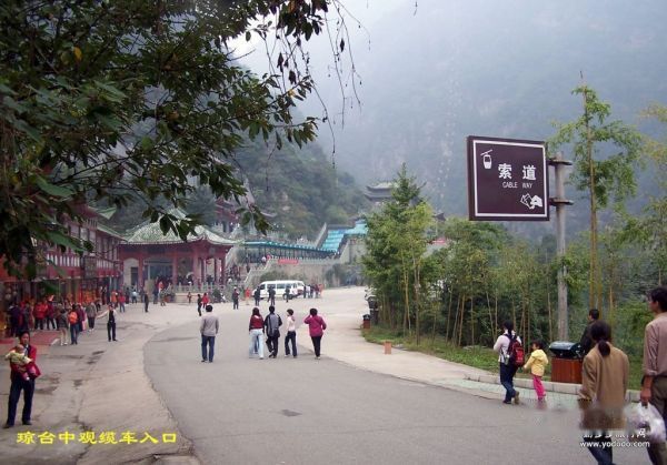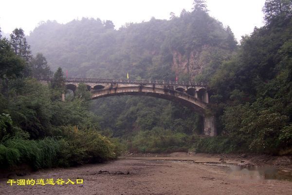 谷口,映入眼帘的是宽敞但已干涸的河床,河床上铺架的木板桥连接着两岸,峡谷两边,是那层迭耸立的山峰,在不远的两山腰间有撺拱石桥相连,桥上不时有汽车过往,在干涸的河床上滚落有大小不一的山石,石间涓流着少得可怜的溪水,在低洼深水处偶见有小鱼游蹿,山脚下有蜿蜒的石条小路,沿途多处也有铺建的木板桥。沿着小路北上,就可抵达峡谷的深处,也就是索道缆车的起点——琼台中观。