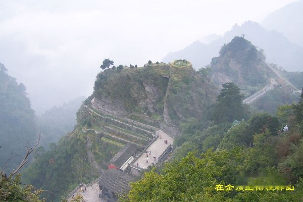 站在金殿前,凭栏眺望,尽管是阴天,尚能透过那或浓或淡的薄雾,一幅幅秀丽的画面若隐若现,近看郁郁葱葱,远眺群山起伏,那随风游离的柔幔轻纱,在山峦间穿梭漂浮,时而升腾,时而缭绕,让人心旷神怡。不少的人在这里焚香磕拜,嘴里不晓得咕噜些么东西,可神态虔诚有余。更有人拿着手机东拍拍西照照,尽管效果能想象得到,但鼓捣起来像那回事。人们全然不顾那阴沉的山风和蒙蒙的雾水,总之能满足“到此一游”的自心灵快感。