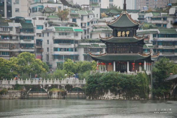 它“始建于明万历二十五年(即1597年),贵州巡抚江东之在此筑堤联结南岸,并建立一楼以培风水”,楼取名“甲秀”,是望贵州“科甲挺秀”和“人文秀天下”之意。“在天启元年(1621年)焚毁后几经重建、增修,规制则保持原貌。”甲秀楼高二十多米,三重檐四角攒尖顶,底层石墙,四周用十二根白绵石巨柱托檐,护以雕花石栏。“甲秀楼”门匾位于三楼的窗棂上。