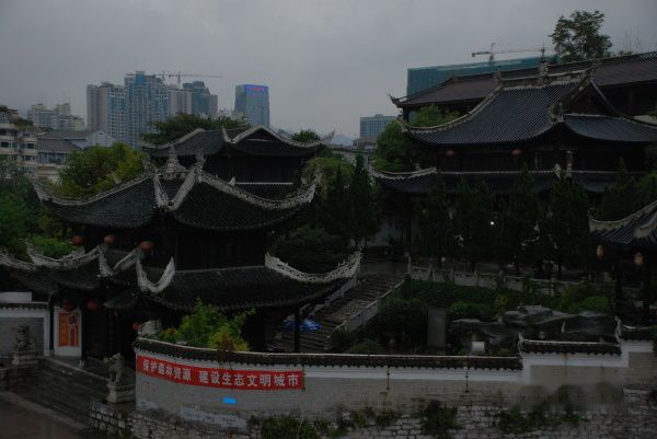 走出甲秀楼,我们到达岸边的翠微阁。它是一组较大规模的古建筑群,始建于明弘治年间。它象是一座大户人家的庭苑,园内静寂无声,一条曲廊折向花园深处,曲径通幽处簇簇矮树和盆景。有时两边修竹婆娑,沿着坡势分布着几层房屋。经过一面花墙后,我们探看了的如今已无人息的“龙门书院”。它究竟见证了一段怎样的读书人苦读和讨论交流的历史呢?只有一两滴檐边的雨声回答我。