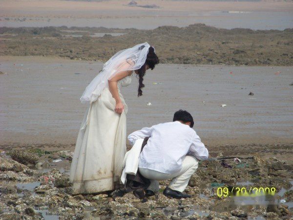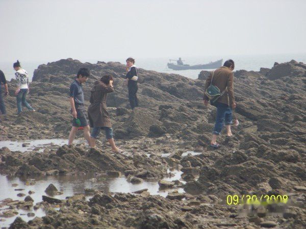 今天又经验了,都去抓螃蟹了。小孩子不敢抓大的,就抓寄居蟹,大人们比小孩还要兴奋,从海边一直抓到远处礁石,连来这拍婚纱照的新郎、新娘都加入了我们的行列。