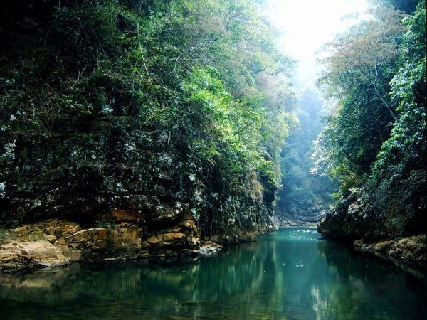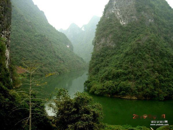 一路上越过重重的高山,汽车盘行在山间的公路间,山很秀丽,放眼过去都是青翠,山的曲线柔和,多为尖顶,顺势向下,在绿茵掩盖不了的地方,偶尔俏皮地露出一大块山石,颜色是白中带着灰,原来这就是著名的喀斯特地貌。