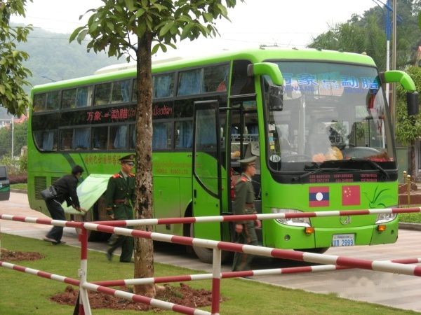 八点过了不知多久终于发车了,九点半到磨憨,人车分开过境。在关口兑了200人民币(两天用量)的老币(Kip),汇率是攻略上说的1270(之后很后悔,应该全部在这边换好的,因为美金在Laos换Kip是怎样也拿不到10,000了)。大约40秒之后便站在边境线之外了(当日有电台采访,受访官员说我们要加强物流通关速度,争取45秒……云云),我证明至少人过关确实在45秒之内。然后是大队人马在这边等车过来,大约有半小时到三刻钟光景。暂别了,我的中国~