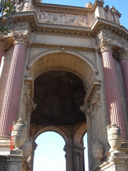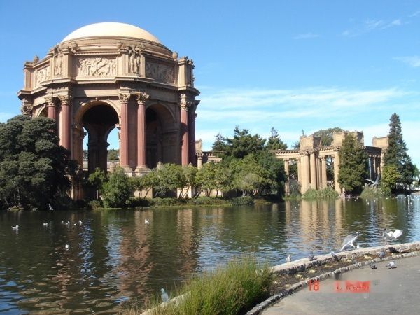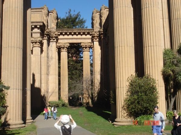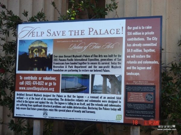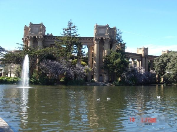 旧金山艺术宫The palace of fine arts 是为了1915年2月20日开幕的巴拿马太平洋万国博览会Panama Pacific International Exposition而建的,只是为了让与会的各国人士感觉壮观美丽,并没有其他用途。但这确实这次博览会后少数被保留下来的建筑物之一。在二次大战期间,它被军方征用为军用仓库,损毁比较严重。后来政府拨经费以及捐款对它进行了重建。人们越来越重视对它的保护,并号召大家捐款。