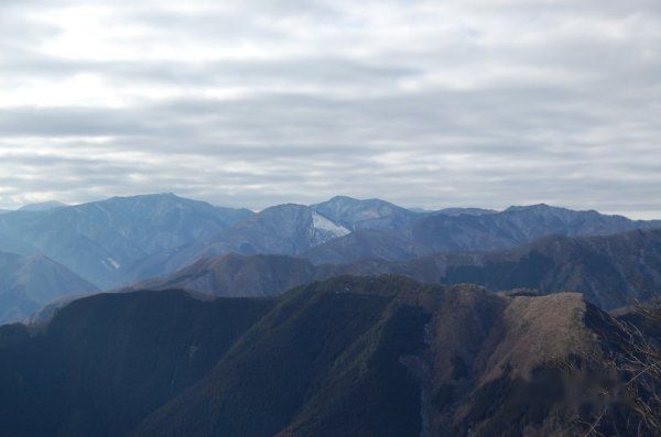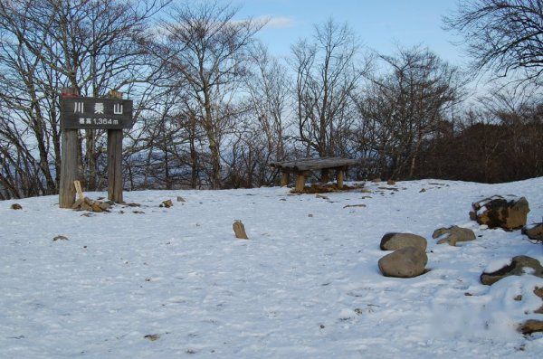 一路走得很慢,雪地行进毕竟稍微困难了一点,到登顶走了4个半小时,比预计的慢了近1个小时。经过一个避难小屋,很快就上到了川苔山之巅(注:川苔山,以前一直叫川乘山,因为日语中“苔”和“乘”发音一样,“乘”属于早期的误写。现在两个说法都存在,不过官方的说法是川苔山,但很多路标,山顶的高度标记都没有改过来,还是沿用“川乘山”的名字)。果然是白茫茫的一片啊,比在登山指南里看到的积雪下的川苔山更白,更好看。正前方可以看到2000多米的云取山,被积雪所覆盖,没有四姑娘山那样的美丽,但也值得一看,也属于要登的山之列。