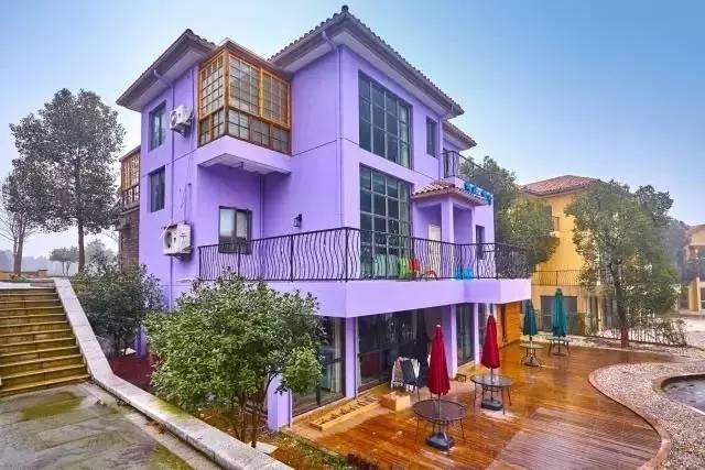 小屋四周绿意盎然,衬得紫色外墙格外梦幻,