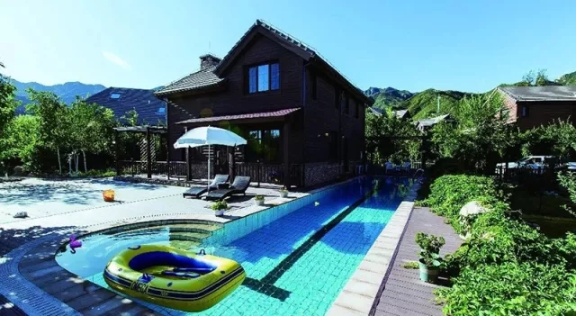 蓝天白云,硕果累累,自带25米长,1.3-1.5米深的私家泳池,日光与泳池搭配,五六好友戏水为乐,水枪、小鸭子玩具任你挑选;