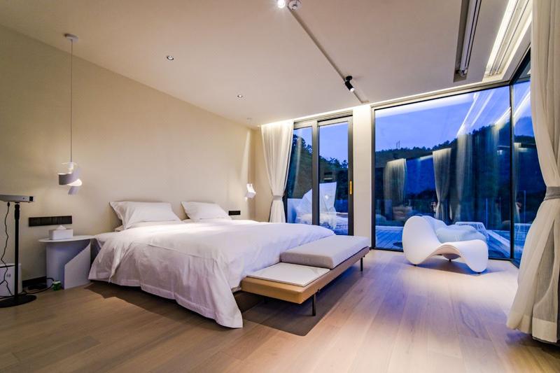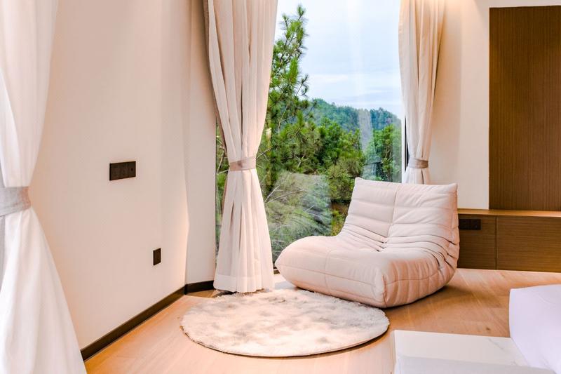 梧鸣谷,取“凤栖梧桐,一鸣惊人”之意,位于浙江省金华市“温泉之城”武义县,村落是一个有着天然瀑布、荷塘月色的崖壁村,也是陶渊明后裔在江南的聚居地。 民宿私汤入户,一期分为两栋别墅,大栋分5间客房,含公共厨房、客厅、餐区、书吧、影音室等公区、还有可以举办派对的超大屋顶露台。每一间客房采用超大落地玻璃,将峡谷山景引入客房,让客人可以躺在床上看青山与云海。 小栋分3间客房,有独立餐区、客厅、露天电影区域。民宿立于山顶,南北纵横两峡谷,四面环山,适宜各种派对、轰趴、同学聚会、小型公司团建。