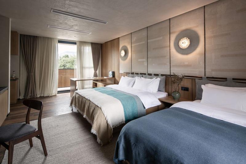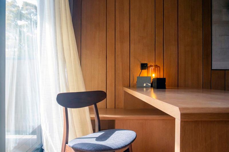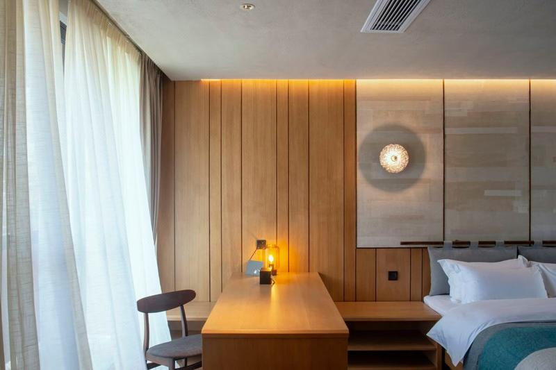 民宿位于昆明市西山区滇池高尔夫别墅区内,在昆明滇池国家旅游度假区西山区南端,距昆明市区约8公里,包含一个18洞国际锦标级标准高尔夫球场,2006年建造,占地面积26万平米,总建筑面积11万平方米,绿化率高达62%,容积率0.48,小区内共340户,由新加坡建筑奖得主--SAA建筑设计所亲历打造。 泮山居类似一座小型的石艺博物馆,不只收藏了具有价值的树化玉、大理石等,其建筑更是由不同的石材构筑,像金刚砂地坪、清水混凝土条石、火山石等等。设计师结合日式的侘寂风将平面的院落"折叠"为四层的立体空间。一楼是一个完整的庭院,餐厅、茶室、会客厅等应有尽有,可以在这里喝茶、看书、赏鱼,感受一种“昆式态度”。进入二楼,这里是光的院落,半弧形的艺术空间,让阳光折射出美好的状态,根据时间的不同,光影游走在弧形的墙上,墙上由大到小的圆形大理石,排出日生日落的景象,和光影遥相呼应。 屋顶是整个四进院最后的庭院,精准测过高度的清水混凝土条石围墙把所有杂乱的景色全部阻挡开,屋顶有两个区域,一个是室内的阳光房,人们坐在这个空间里面,被西山270度的景观全部环绕,放眼望去,睡美人山近在眼前。另外一个区域是室外露台,U型座位围绕着不规则圆形大理石桌子,敞开式欣赏西山美景,大理石桌面形似山峰的图案,与西山遥相呼应。步入负一楼,有一个可以容纳15-20位的影音室,内部配有KTV和影院两套系统。打开月亮门,负一楼还隐藏着一个火山石温泉泡池,游走于此,移步异景,光景穿过火山石介入到空间当中,可体验到犹如在洞穴当中泡温泉的感受。