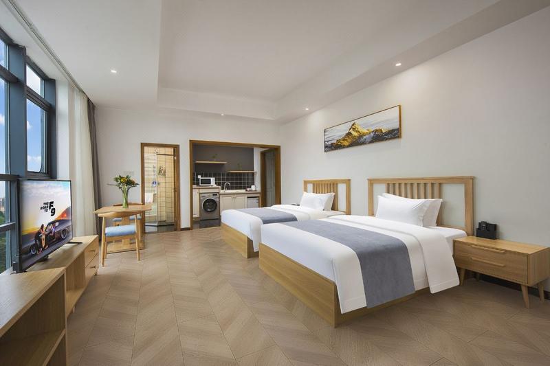 宜宾市临港新区地标建筑“APM广场”距离白塔山风景区约3.6公里,天立国际学校(中小学)约1.2公里;周边就有绿源超市,药店、银行、公交站、火锅店、川菜、万家福、KTV、酒吧、网红打卡地(水街)约1.3公里、第二人民医院临港院区等商业体均在2公里之内。浙商临港新天地更是一个美食广场,电影院、服饰、娱乐等等聚集地。 公寓配有精致大床房、拾光双床房、高级观景房,能满足不同客户群体的居住体验需求。房间装修简约,时尚和现代的元素。房间整洁亮丽,家具家电齐全,是出差和旅行的居住优选。