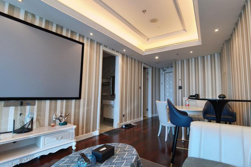 厦门怡海湾双子塔海景公寓位于厦门地标——世茂海峡大厦。大厦共计64层,300多米高,外观采用的是帆船建筑, 犹如扬帆起航的帆船迎风而来。公寓大厦周边景区密集,到厦门大学和南普陀步行5分钟左右;步行约十分钟就可以到达厦大白城;离中山路和曾厝垵都很方便;下楼50米不到就是厦门沙坡尾;楼下另一边就是厦门临海位置非常棒的观景台。 公寓房间整体设计采用的是时下流行的简欧风格,空间呈现温馨的暖色调。白色的石膏板吊顶,配上特有的浅褐色和白色相间的竖纹墙纸,加上深色的木地板,再用暖色的沙发和床,以及暖色的书桌、衣柜进行点缀,营造出典雅、自然、高贵的气质、浪漫的情调。 生活在繁杂多变的世界里已是烦扰不休,而房间营造出简洁、自然的生活空间却能让旅者身心舒畅,感到宁静和安逸。借着室内空间的重组,便可以满足我们对悠然自得的生活的向往和追求,让我们在纷扰的现实生活中找到平衡,缔造出一个令人心弛神往的写意空间。 不论是公寓的装修材料,还是房间里的设施和设备均为进口国际品牌,耗巨资打造,智能密码锁系统、烘干机、洗衣机、电视机、电冰箱、微波炉、热水器等等设备一应俱全!还有电动窗帘,一键开关,即可享受厦门的山、海、城的美丽风光。