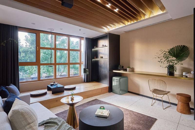 水是眼波横,山是眉峰聚。 湖城坐落于绿水青山之间,木食则隐于湖城之中。 木食•老湖州城市民宿的设计师沈勇(笔名老南瓜)是资深的品牌策划师、建筑设计师、室内设计师,拥有20余年从业经验。他是杭州名仕装饰设计创始人、素墨堂设计创始人。 大名鼎鼎的莫干山•隐西39和语自在•墙门文化精品民宿均由其独立操刀设计。而木食•老湖州城市民宿则是他的又一力作。 人生只合住湖州,这个隐于江南,诞生过张志和、赵孟頫的城市,有着其非凡的魅力,需要在对的时间和对的地点去发掘。 而木食却以另一种方式将湖城山水览进一居之内。 入户便是跃然于眼的娟娟水流和静溢枯山水,拾阶而入,黑钢和木搭配而成的阶梯式座椅让人眼前一亮,颇具古意的吧台和茶座以及被流水环绕的开放式茶室相呼应,多种元素完美地融合于一厅之内。 无论是会议、包场还是公司团建,这都是非常好的选择。 而吧台,又是木食的一大特色之一。 木食的所有咖啡豆都是自己烘焙,由数年咖啡工作经验的咖啡师每日调试,并且配备咖啡机中的玛莎拉蒂—La Mazzocco GS3,其品质不仅在民宿中,就算是放置于精品咖啡馆也能占据上席之位。 而木食的茶叶也是上选,这里有湖州知名的黄金芽、来自武夷山的肉桂、来自福鼎的陈年老白茶和老板珍藏多年的陈年古树普洱。你永远猜不到,木食有多少好茶。你更不会知道,木食的管家还都是资深茶艺师,她们很愿意和你聊聊茶,或者咖啡。 当然,你还可以在木食享用到红酒和鸡尾酒调饮以及精酿啤酒和清酒等各种酒饮,木食也可以化身为一个隐于城市角落的安静小酒馆。 现在,我们继续拾阶而上,自然就到了住宿区了。 木食•老湖州城市民宿采用了全智能化家具设计,进门只要打声招呼,贴心智能管家“小爱同学”便会为你打开窗户和灯。智能家具连接着所有的灯光、窗帘窗纱、音响和投影设备,无需动手找开关,轻轻张嘴,便能控制全屋。 家具陈设采用黄铜、黑钢、大理石等质感十足的元素,抱枕和摆件颇具当地特色,和老湖州风格相呼应。 高明的设计不是华丽的炫技和无畏的奢侈堆砌,而是润物细无声的体验,这也是设计师老南瓜常说的一句话“让设计润起来”。 木食共有七个房间,分别是“个么”、“粑忒”、“吻得”、“澜哉”、“介滚”、“符锁”、“宵旮” 不是湖州的朋友看到这些肯定有些云里雾里,但是老湖州人看到必然会焕然大悟,然后会心一笑。 原来这都是湖州本地的常用方言音译。这其中释义且让我慢慢给你们道来。 “个么”的意思是——那;是句首的发音,是最开始也是最常用的话,亲切而又温和。像是每个地区都会有的口头语一样,没了它语句也通顺,但是却少了点味道,而“个么”就是湖州的味道。 “粑忒”的意思是——再见或者慢慢来;是温柔的道别和另类的欢迎,透露着关心和湖州人的热情。不同于再见二字的随意性,“粑忒”透露出的是让人内心微微湿润的关心。 “吻得”的意思是——哇塞、哎哟;仿佛能从文字中能听见声音,那是带着笑意的赞赏,也是独特的打招呼方式。 “澜哉”的意思——超级棒;这也是老湖州人的口头禅“烂赞”,例如“木食真的是烂赞”,是不是一下就能体会到了呢。 “介滚”的意思是——厉害,也能体现事情的高程度;可以把这当做“这么厉害啊!”的意思,仿佛有种亲切的感觉在耳边萦绕,虽是俗语,却很近人。 “符锁”的意思是——干嘛,随意的一句却搭载了生活琐碎片段的大部分,是让人莫名放空的一句话,字里字外都透着一股悠闲写意。 “宵旮”的意思是——别这样啊;这种略显亲昵的话语总是能在无形间把人和人的距离拉近,让生分在无形间消失,让舒适充斥与你我之间。说这句话的时候,大家想必都是带着发自内心的笑容的。 老湖州的魅力不仅仅在于绿水青山和小桥流水,更在于这个历史文化名人云集的老城居民一颦一笑,举手投足间流露的畅意和舒然,这是在其他地方很难体会到的。 而木食•老湖州城市民宿将将这些,都融入到了自己的每一处细节设计之中,我们很难将之一语道尽。如果你想了解更多老湖州特色,想了解木食,那不妨来这坐坐,我们话语闲聊,为你细细道来。