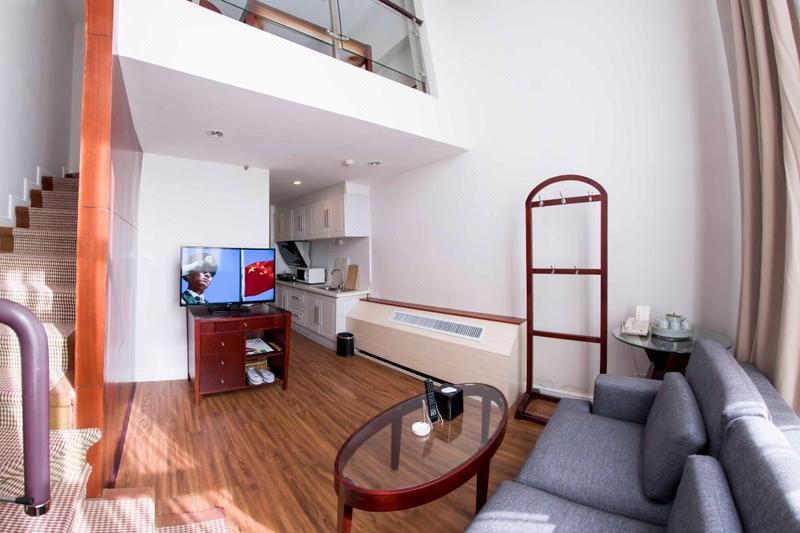 公寓坐落莱山区莱源路,毗邻荣乌高速路口,公寓门口更有机场巴士3号线可直达烟台蓬莱国际机场;临近烟台大学、山东工商学院等烟台学府,覆盖佳世客、银座商城、振华商厦等各大商圈,距离烟台市政府、海水浴场、国际博览中心约8分钟车程,为您的出行提供更多便利选择。 公寓内安装有中央空调,并且提供无线WiFi以及24小时热水供应;客房为复式格局,内部有楼梯,分为上下两层。房内有独立的客厅、卧室与卫生间,电视、沙发、书桌、衣柜等生活设施一应俱全,同时公寓内可满足自己动手做饭的需求。 公寓与高星级酒店共享公共设施,内设健身房、大堂吧、茶室、多功能厅、商务中心等休闲设施,2楼为中式零点餐厅,涵盖鲁粤川湘四大菜系;上雅铁板烧自助餐厅,正宗日式料理. 公寓实行智能化管理,配备有24小时周界防盗电视监控系统,公寓东侧设有全封闭停车场供您使用,为您提供一个整洁、舒适、安全、宁静的住宿环境。