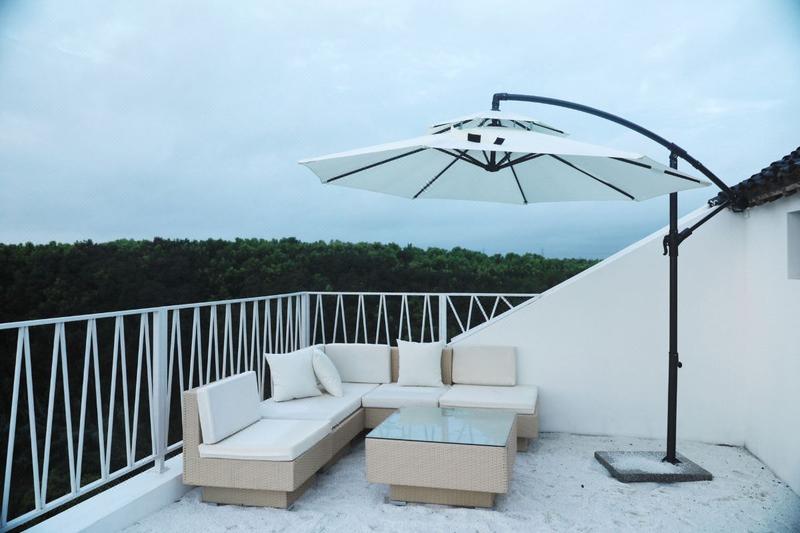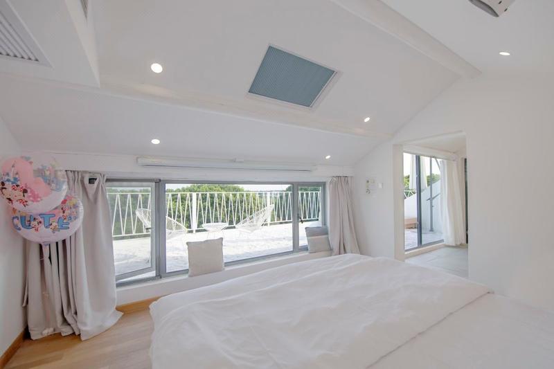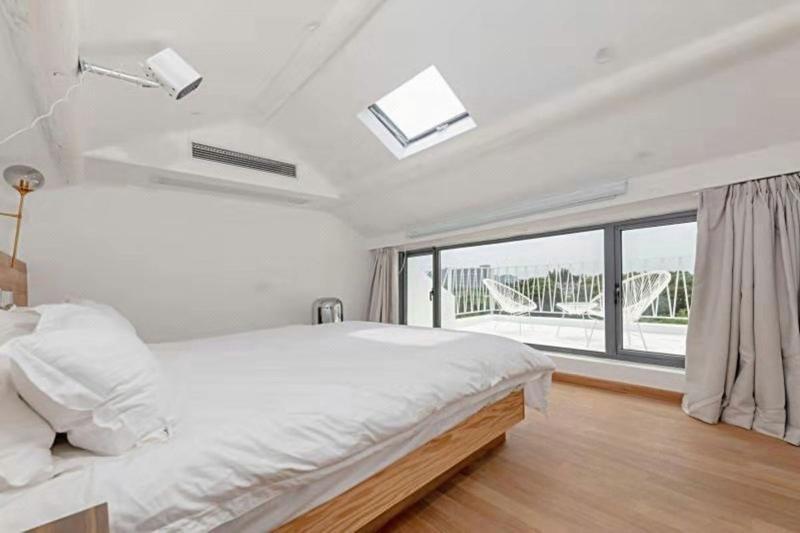 这是一家独立的整栋花园别墅,带些徽式的装修风格,配备建筑师精心设计的景观,好像能唤起每个人内心深处对田园的向往。微风吹起纱幔,落地窗外,是一片绿意盎然(大窗房)远离城市的喧嚣,时间也慢了下来。沏一杯香茗,捧一本好书,感受游离在上海快节奏之外的惬意。在晚上,还可以跟你的朋友一起数星星,听蛙鸣,或是同赏迪士尼升起的烟火。