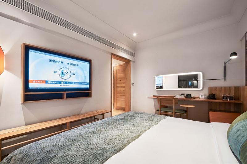熊猫很困P.d PANDA HOTEL,坐落于成都市中心的太古里与春熙路商圈,是一家汇聚城市人文情怀的设计型艺术酒店。熊猫很困P.d PANDA HOTEL通过打造可变空间的设计手法,为城市老旧建筑赋予新生,焕发全新的生命力,成为城市景观新名片。 酒店由国内著名设计师赖旭东亲率团队设计打造,是以熊猫文化为主题的设计师艺术酒店。设计师以简约的线条呈现极致经典的设计思维,从公用空间到房间内部,巧妙地运用可变空间的设计创意,合理划分功能分区,在极大程度满足空间功能性的同时,通过明快色彩的撞色点缀与创意装饰的搭配组合,为您带来更具独特性与舒适性的入住体验。 酒店大堂入口处及外墙上几只憨态可掬的全白色熊猫吉祥物雕塑,给入住贵宾传达了酒店的睡眠好品质:熊猫好入眠,告别黑眼圈。 整个酒店以莫兰迪色系和大幅艺术画、趣味性的大猩猩雕塑、充满奇趣的艺术品,量身定制的家具、熊猫主题挂画和艺术灯具等陈设营造出极具特色的时尚中古风。 酒店客房的标准更是达到了时尚轻奢的顶峰。全房配置有:量身定制的高级家具、熊猫定制灯具、过道熊猫吉祥物雕塑、全遮光电动风琴帘、鹅绒床品、中央空调、设计款热水壶、智能马桶、柠檬马鞭草系列洗护用品等。 酒店现设有108间甄选舒适客房、熊猫早餐厅、24小时自助洗衣房与健身房、精英会议室、免费停车场等,让您在此既能与都市的繁华相拥,又能觅得一处静谧安逸,快来与熊猫一同酣睡,告别黑眼圈。