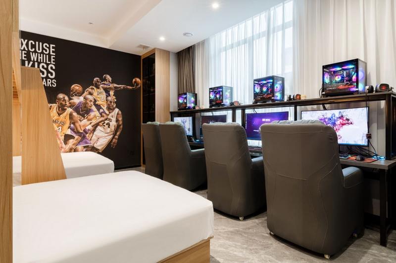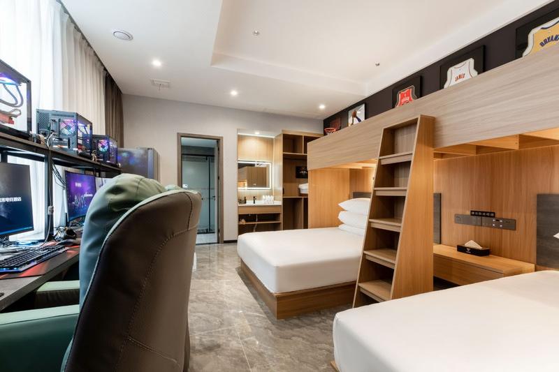酒店坐落于科技城新区创业园街道八角中路8号倍特香槟华府一期2栋,以高端、时尚、青春、多样化、智能化为理念,丰富的配套设施为基础,全方位为客人提供优质的服务和舒适体验。酒店配置大床至六人间近十种房型,尽可能满足玩家的各类社交需求。全屋智能语音系统、专业电竞设备、中央空调、双开门大冰箱、24小时在线客服全天服务、24小时自助洗衣房、免费提供洗面奶、卸妆巾及创口贴、药箱、酒精等,满足您对理想电竞空间的所有幻想。在这里您可以足不出户,转过身便可随意选择近二十种各类饮料及零食。夜深了,当您略感一丝疲惫躺在床上的时候,您只需轻唤一声智慧管家,将房间调到睡眠模式,便可关闭一切灯光及窗帘。顺便让智慧管家将空调调至您喜欢的温度,享受一晚放松的深度睡眠......