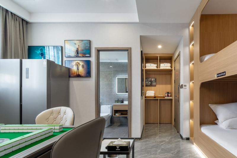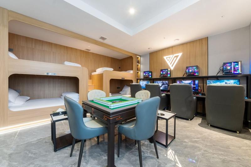 酒店坐落于科技城新区创业园街道八角中路8号倍特香槟华府一期2栋,以高端、时尚、青春、多样化、智能化为理念,丰富的配套设施为基础,全方位为客人提供优质的服务和舒适体验。酒店配置大床至六人间近十种房型,尽可能满足玩家的各类社交需求。全屋智能语音系统、专业电竞设备、中央空调、双开门大冰箱、24小时在线客服全天服务、24小时自助洗衣房、免费提供洗面奶、卸妆巾及创口贴、药箱、酒精等,满足您对理想电竞空间的所有幻想。在这里您可以足不出户,转过身便可随意选择近二十种各类饮料及零食。夜深了,当您略感一丝疲惫躺在床上的时候,您只需轻唤一声智慧管家,将房间调到睡眠模式,便可关闭一切灯光及窗帘。顺便让智慧管家将空调调至您喜欢的温度,享受一晚放松的深度睡眠......