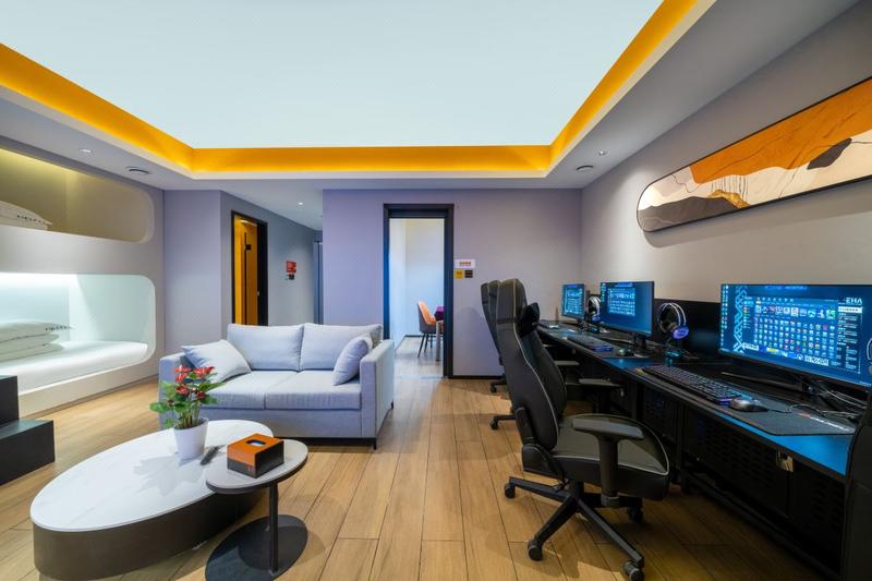 本店是EHA电竞酒店连锁品牌高配置萤火系列酒店,所有客房均配备智控智能化系统、小度智能家居音箱。可通过小度操控智控触设备喔~除此之外客房配备456L双开门冰箱、智能恒温马桶、100寸巨幕投影等,只为给您更好的舒适体验。电竞设备 显示器:华硕XG27AQ-W,华硕VG27BQ,华硕VG279QM.....显卡:华硕3060 华硕3070 华硕3080共外设配有达尔优键盘鼠标,本店玩家国度官方授权喔~酒店位于武汉市硚口区中山大道裕亚俊园49号,地处武汉二环线内。酒店欢迎您的光临。