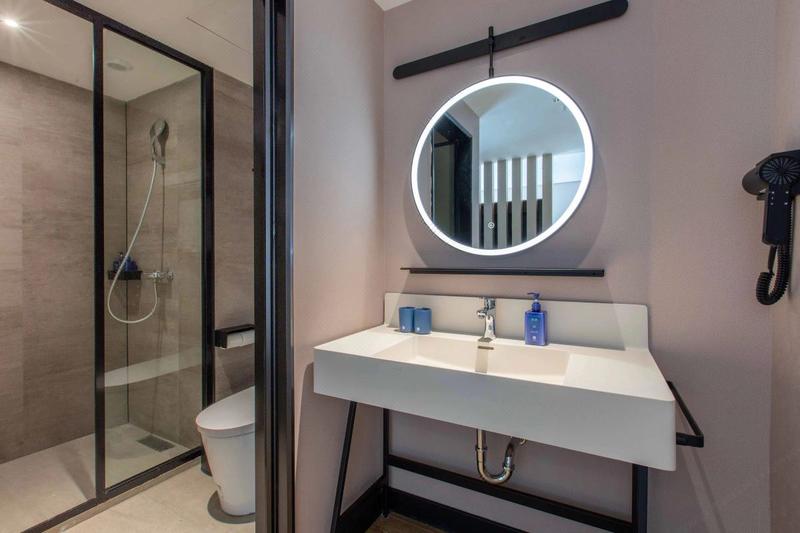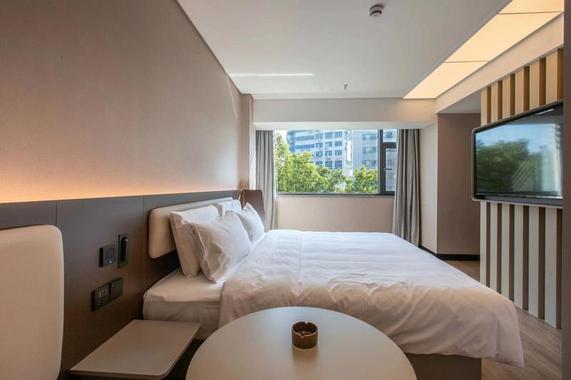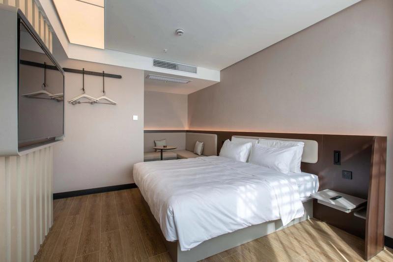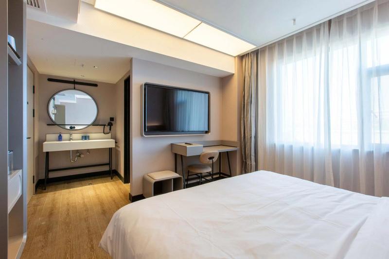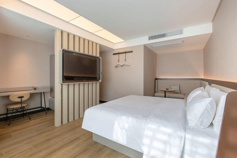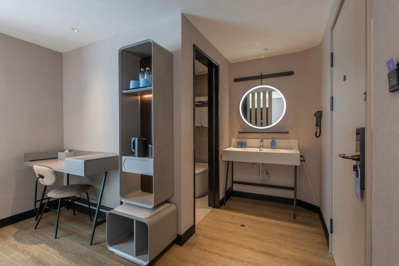 汉庭酒店 让人眼前一亮,全新升级、崭新力作,以低饱和的舒适配色及柔美利落的线条,诠释"实用主义"的美学理念,智能高科技设备,打造30S入住,机器人送物、24h洗衣、图书借阅等6大自助体验,高颜高效果。摊点式早餐呈现国民本味,明档面点暖心暖胃:客用品、家具舒适度再升级,符合人体工学的同时注入环保、科技理念,为客人带来“住得起的好品质、看得到的好设计"。